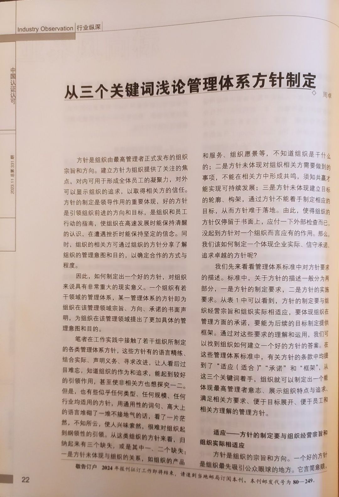 近日,华亿认证中心专家周卓撰写的《从三个关键词浅论管理体系方针制定》被《中国认证认可》杂志(总第331期)刊登。